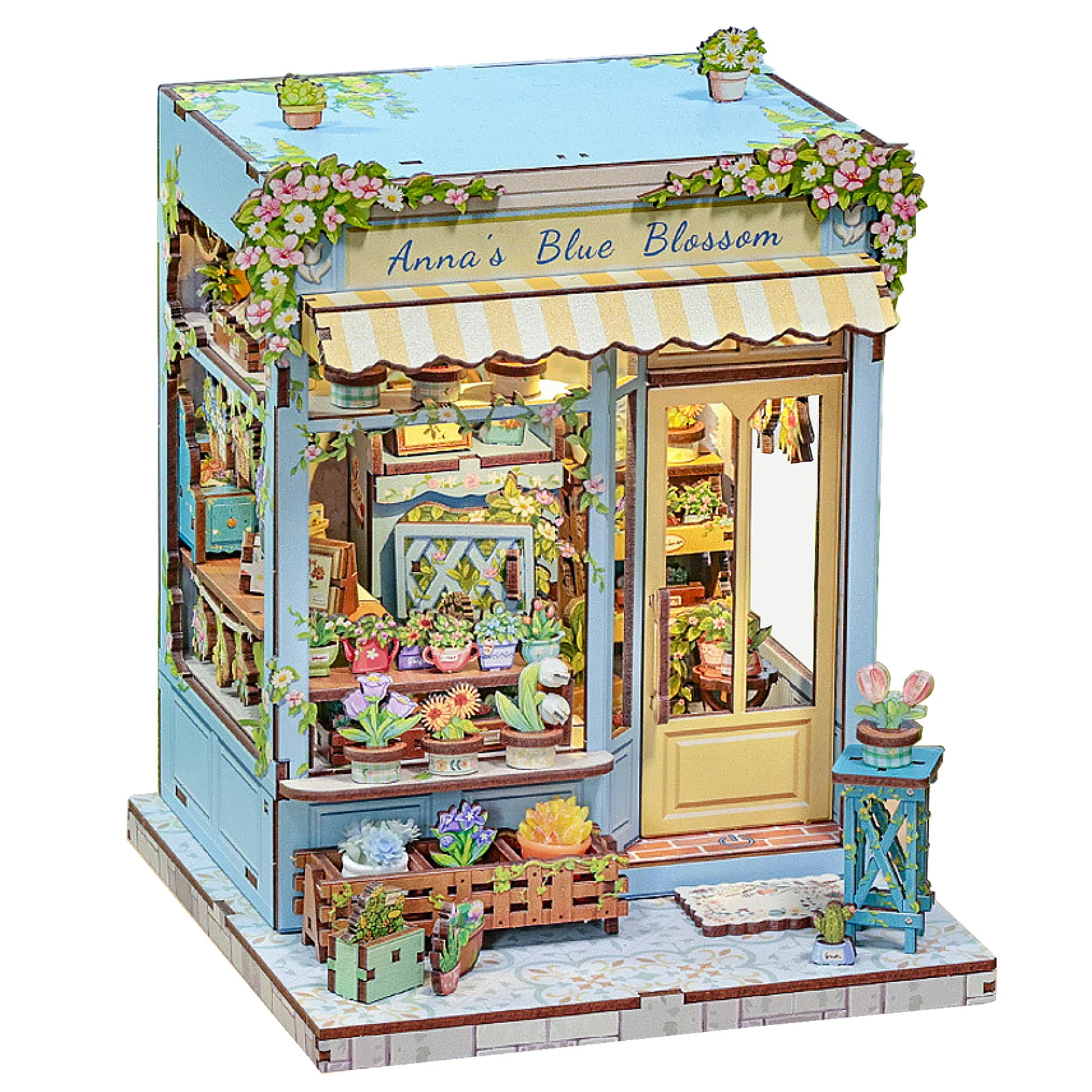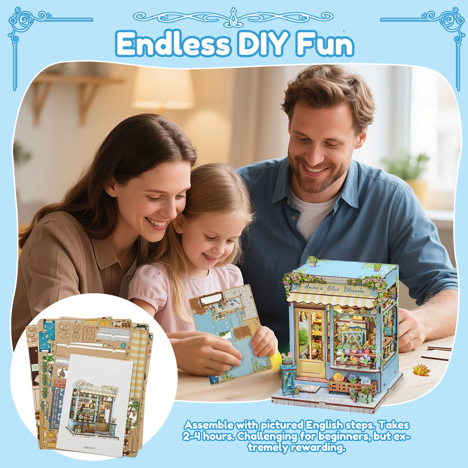 Description : This LED lit DIY mini house is a charming decor for gardens , cafes , and indoor spaces . With numbered parts and illustrated English guides , it involves gluing , sewing , etc . , offering fun DIY . Taking 2-4 hours to assemble , it builds skills and makes a great present for craft lovers
