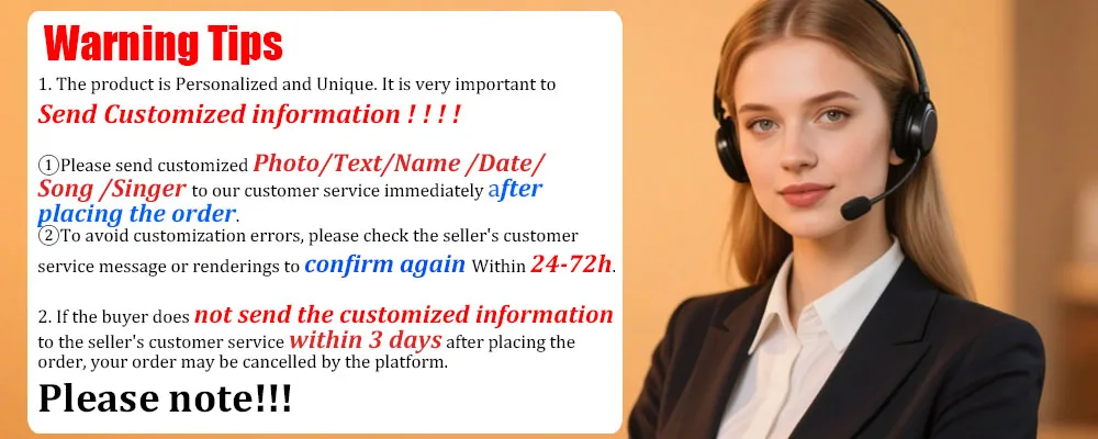 ①Please send customized Photo/Text/Name /Date/Song /Singer to our customer service immediately after placing the order.